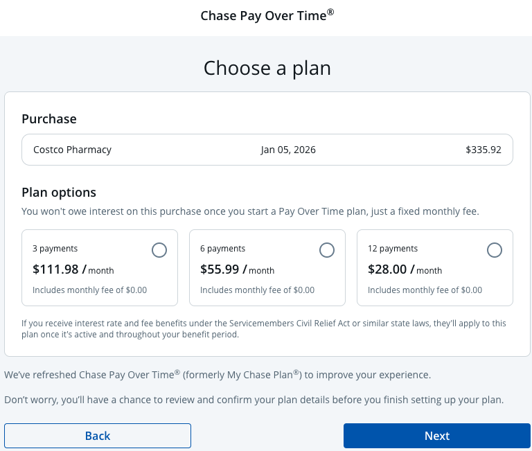You have multiple options when selecting Chase Pay Over Time to finance a purchase. Possible durations range from three to 24 months, so it’s important to select the option that’s best for you, as it will affect payment amounts.