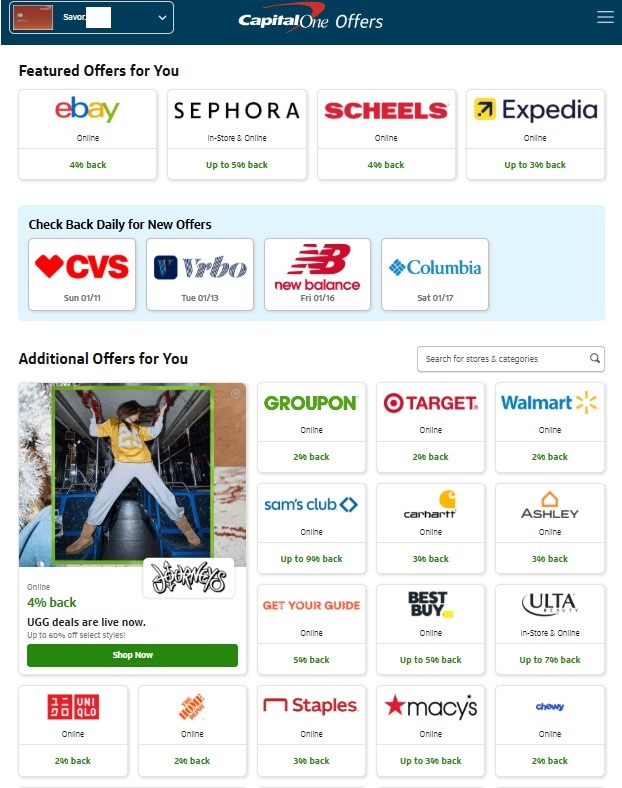 Similar to Amex Offers, Capital One Offers is card-specific. This means you may have different offers available for different Capital One credit cards you have, and that you can stack more than one deal when that’s the case.