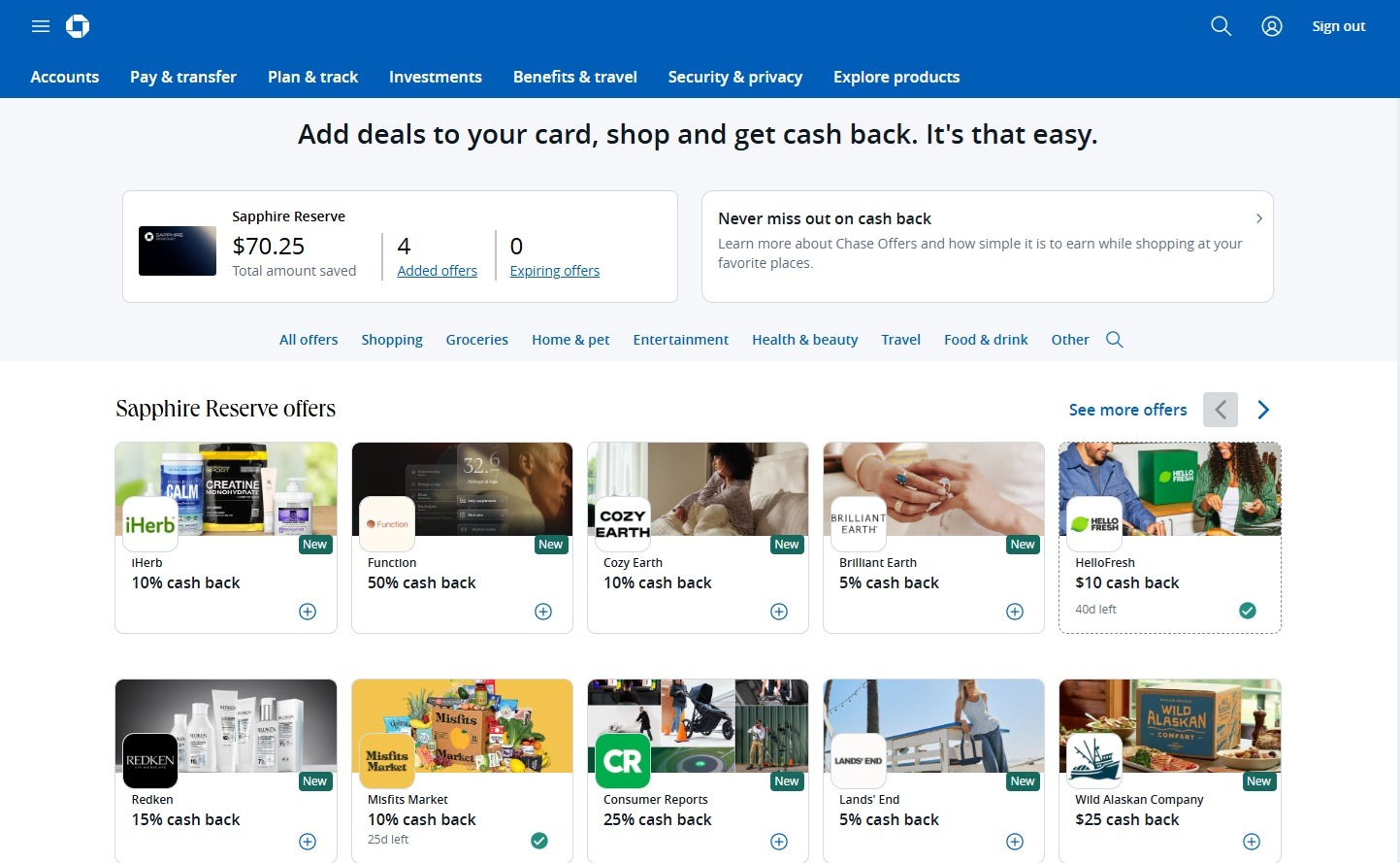 Chase Offers sits somewhere between Amex and Capital One in terms of simplicity, with common categories including dining, travel, groceries, and subscription services. These offers come in the form of statement credits or bonus cash back tied directly to your Chase rewards credit card.